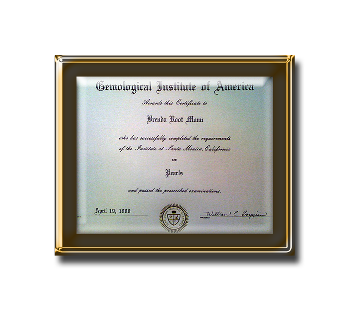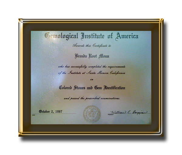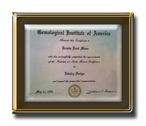 Brenda Root Monn is a Graduate Gemologist and is certified in Jewelry Design and Insurance Replacement Appraisals by the Gemological Institute of America. She is also certified as a Master Jeweler by The Jewelers Institute of America, and has been creating original jewelry on the premises for thirty eight years.