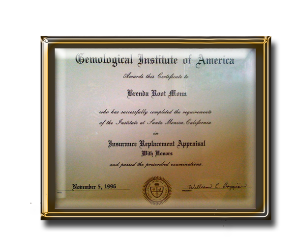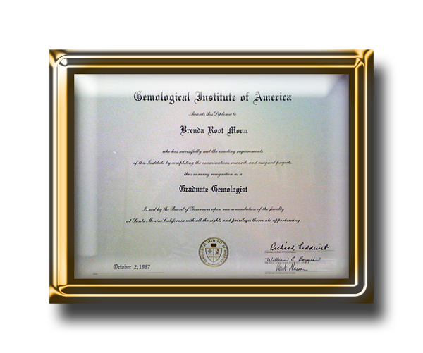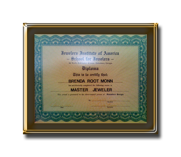Brenda Root Monn is a Graduate Gemologist and is certified in Jewelry Design and Insurance Replacement Appraisals by the Gemological Institute of America. She is also certified as a Master Jeweler by The Jewelers Institute of America, and has been creating original jewelry on the premises for thirty eight years.
